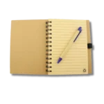 Agenda ecológica con esfero, hecha en cartón reciclado. Tamaño 18 x 13.8 cm. Personalizable mediante tampografía o screen. Ideal para campañas sostenibles y regalos corporativos.