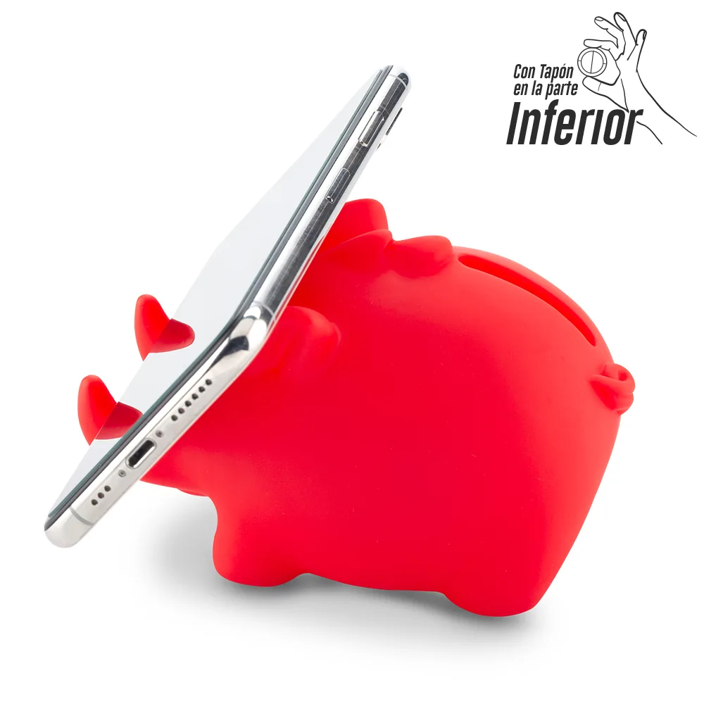 Una divertida alcancía con forma de cerdito que además funciona como soporte para celular, ideal para escritorios en oficinas, hogares o instituciones educativas. Fabricada en PVC resistente, combina funcionalidad con un diseño atractivo. Incluye sistema de empaque y desempaque sencillo, lo que la hace práctica para almacenar o entregar como obsequio promocional. Puede personalizarse mediante tampografía en un área de hasta 4 cm.