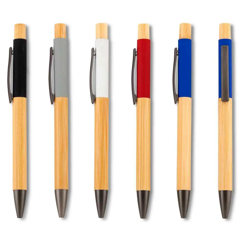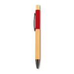 Bolígrafo en bambú con detalles metalizados y clip metálico, con mecanismo push en bambú. Mide 14.4 cm y es perfecto para una imagen premium y natural, personalizable con láser o tampografía (hasta 4 cm).