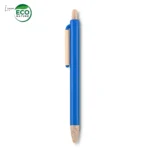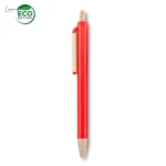 Bolígrafo plásticoelaborado con fibra de trigo (50% aprox). El porcentaje de material ecológico tiene un promedio de biodegradabilidad de 2-3 años después del fin de su vida útil. Clip de cartón. Mecanismo push. Medidas: 14 cm Marca: 4 cm / Tampografía