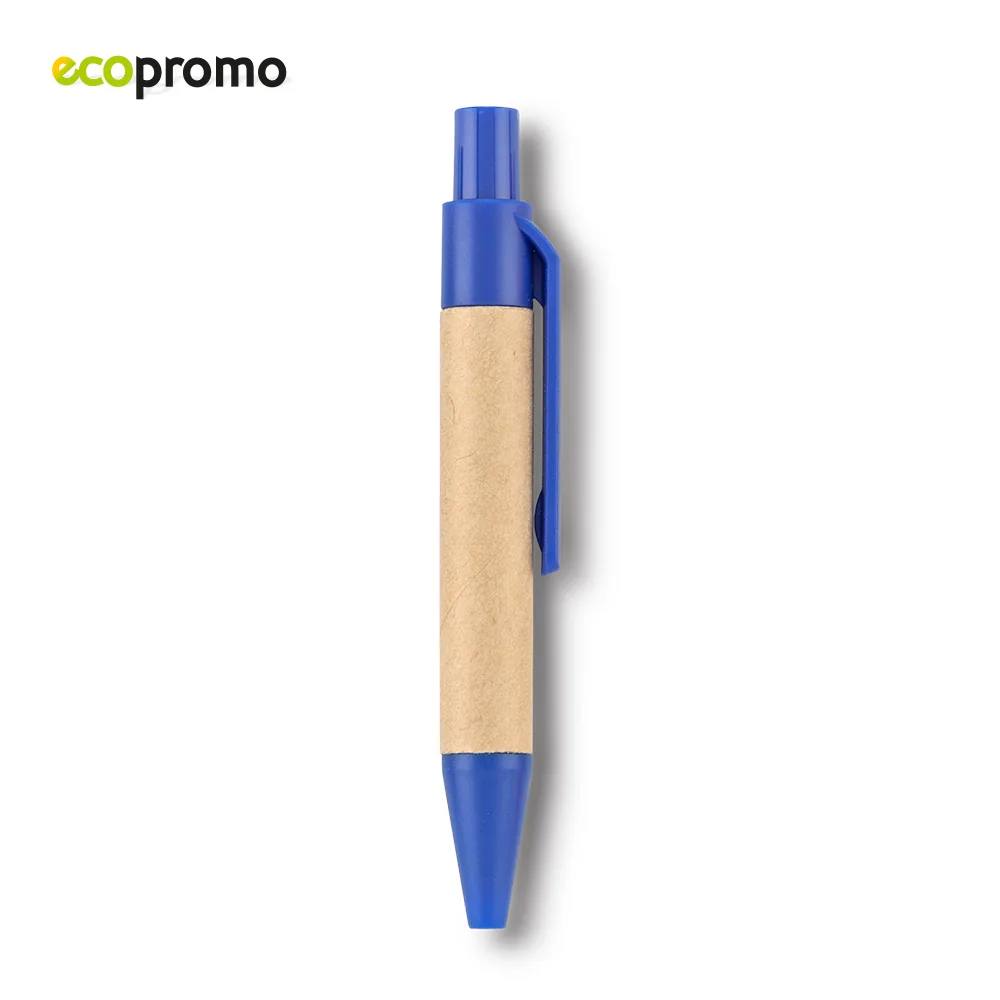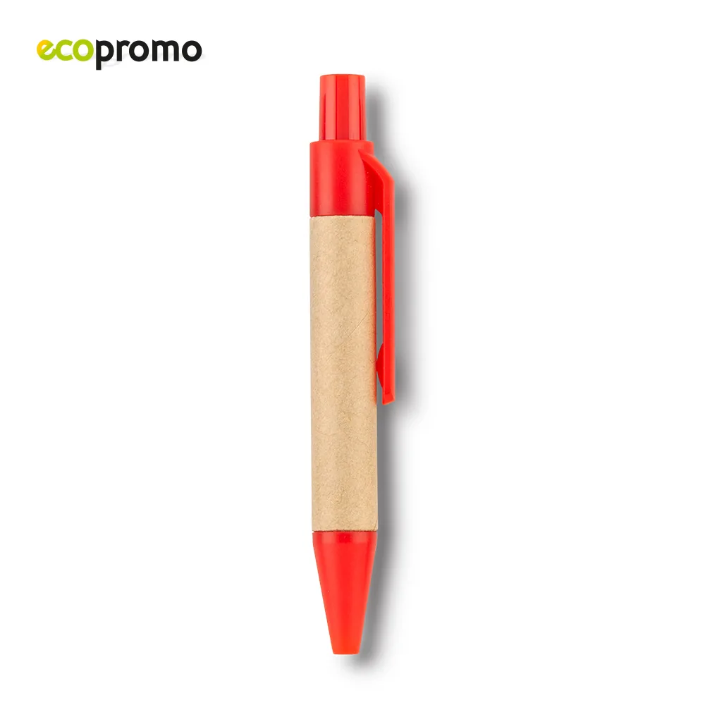 Mini bolígrafo ecológico de cartón con clip y punta plástica, ideal como bolígrafo promocional para empresas. Mide 8.5 cm y se personaliza con tampografía (2 cm).