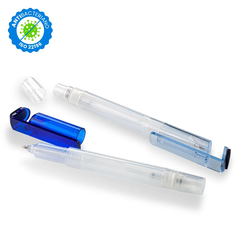 Bolígrafo plástico con tapa importado; limpiador de pantallas en la punta de la tapa y soporte portacelular. Mina adicional. Barril antibacteriano tratado para inhibir y prevenir el crecimiento bacteriano sobre el cuerpo del bolígrafo gracias a la tecnología nano silver, un tratamiento especial realizado con iones de plata. Las bacterias al contacto con el bolígrafo se repelen y reducen hasta en 99%. Trabaja las 24 horas al día y permanece libre de microbios y bacterias. Material antibacteriano en cumplimiento de estándar ISO 22196: 2011 (Medición de la actividad antibacteriana en plásticos y otras superficies no porosas.) Capacidad para líquido 3.8ml (Entre 45-50 push del spray aprox). *Debido a la transparencia del material, las partículas de iones de plata pueden ser visibles en algunos casos* Recargable apto para líquidos únicamente. Líquido Antibacterial de producción Nacional. Registro Invima. Artículo para uso personal, no se admiten cambios/devoluciones. Medidas: 15 cm Marca: 4 cm / Tampografía Producto con condiciones especiales de Alistamiento. Consulte con su asesora de servicio al cliente