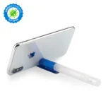 Bolígrafo promocional 4 en 1 antibacterial con tapa: incluye soporte portacelular, limpiador de pantalla en la tapa y spray recargable. Barril tratado con tecnología “nano silver” (ISO 22196:2011). Mide 15 cm y se personaliza con tampografía (4 cm).