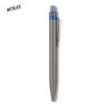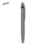 Bolígrafo promocional ecológico en aluminio post-consumo con clip metálico y mecanismo push. Mide 14 cm y se personaliza con láser (3.5 cm).