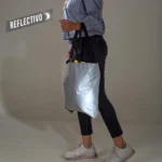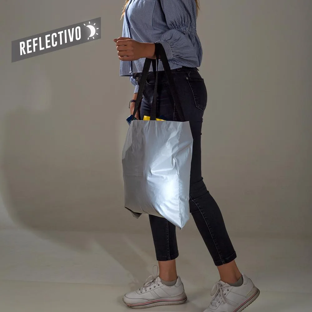 Bolsa reflectiva en poliéster con manijas en reata. Alta visibilidad y uso funcional.