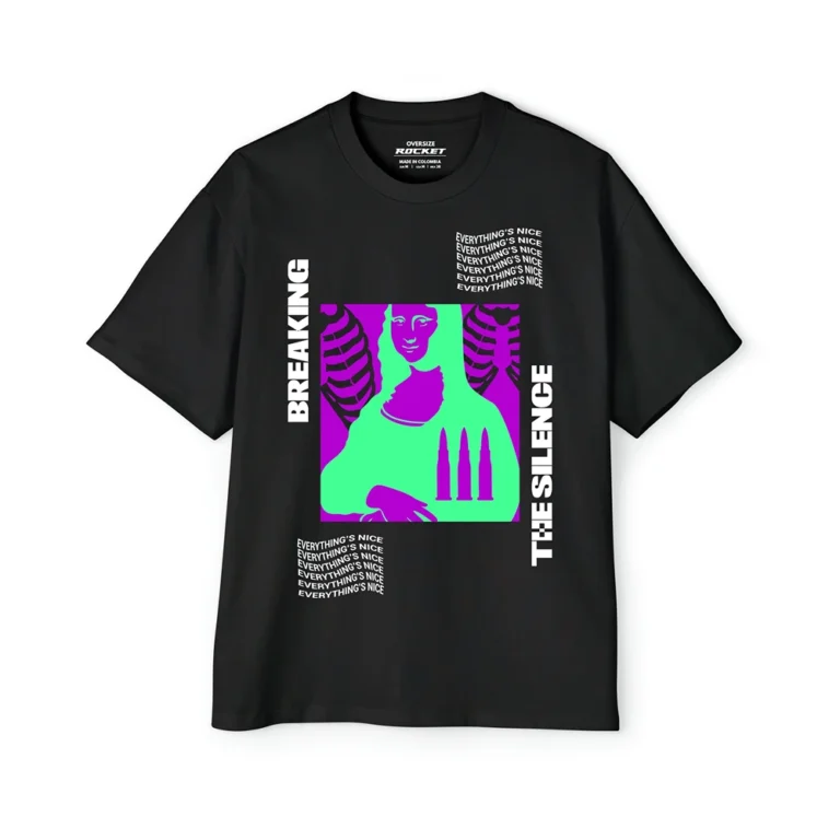 La Camiseta Oversize Negra Breaking the Silence combina arte urbano y estilo vanguardista. Está confeccionada en algodón pesado de 210 gramos, lo que garantiza una textura premium, durabilidad y confort.