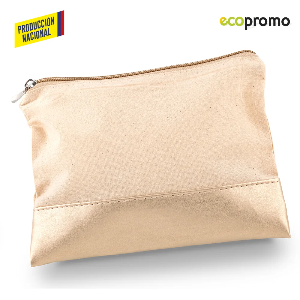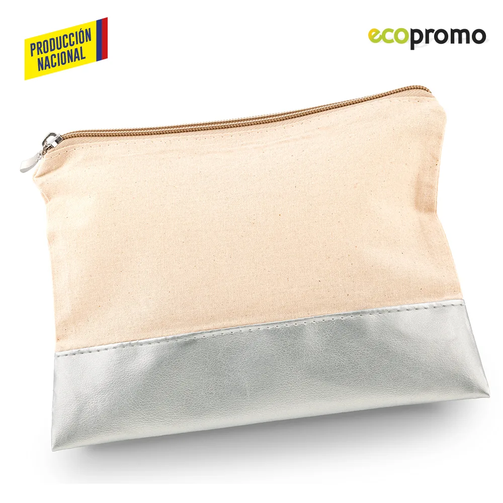 Cosmetiquera en lona cruda con base en PVC y cierre de cremallera. Resistente, práctica y de fabricación nacional.