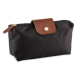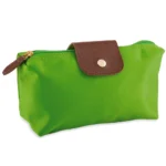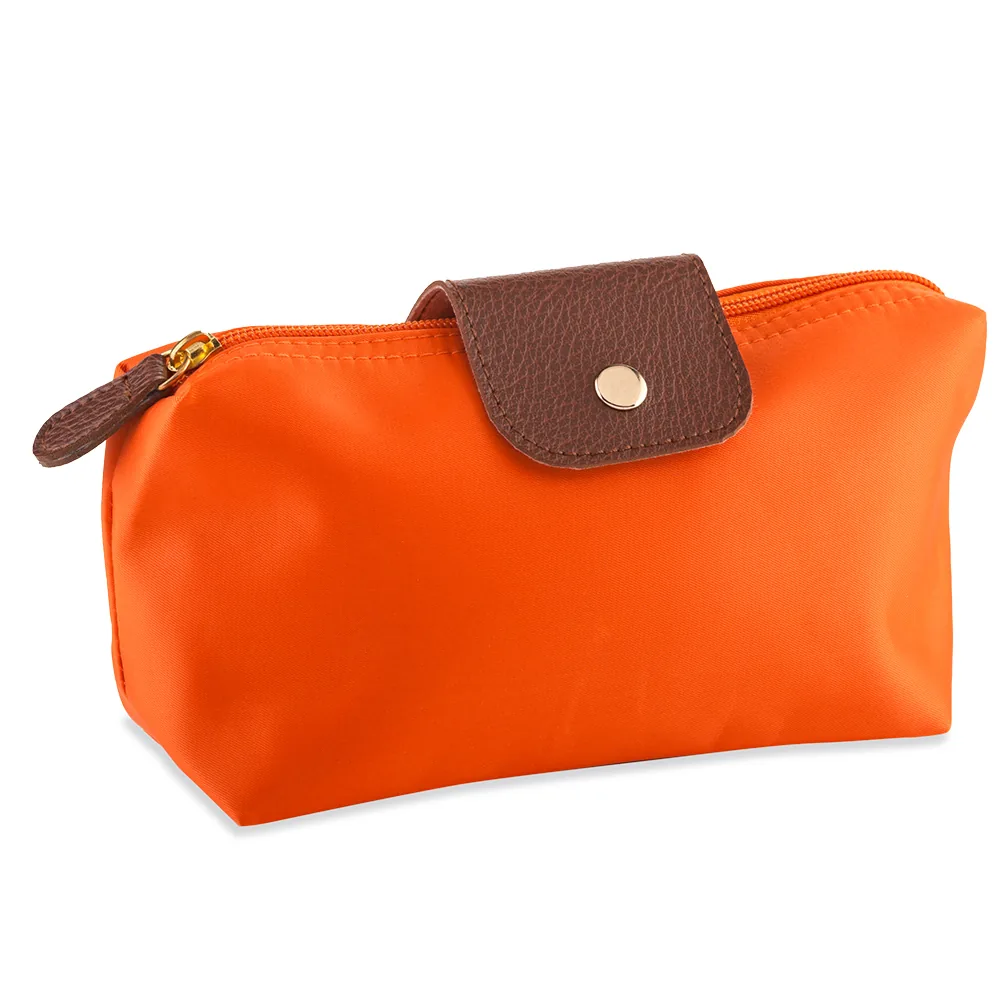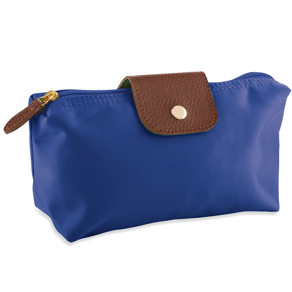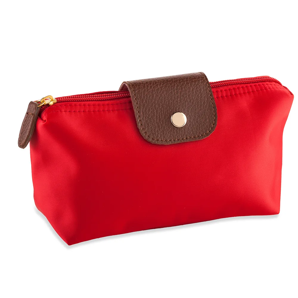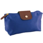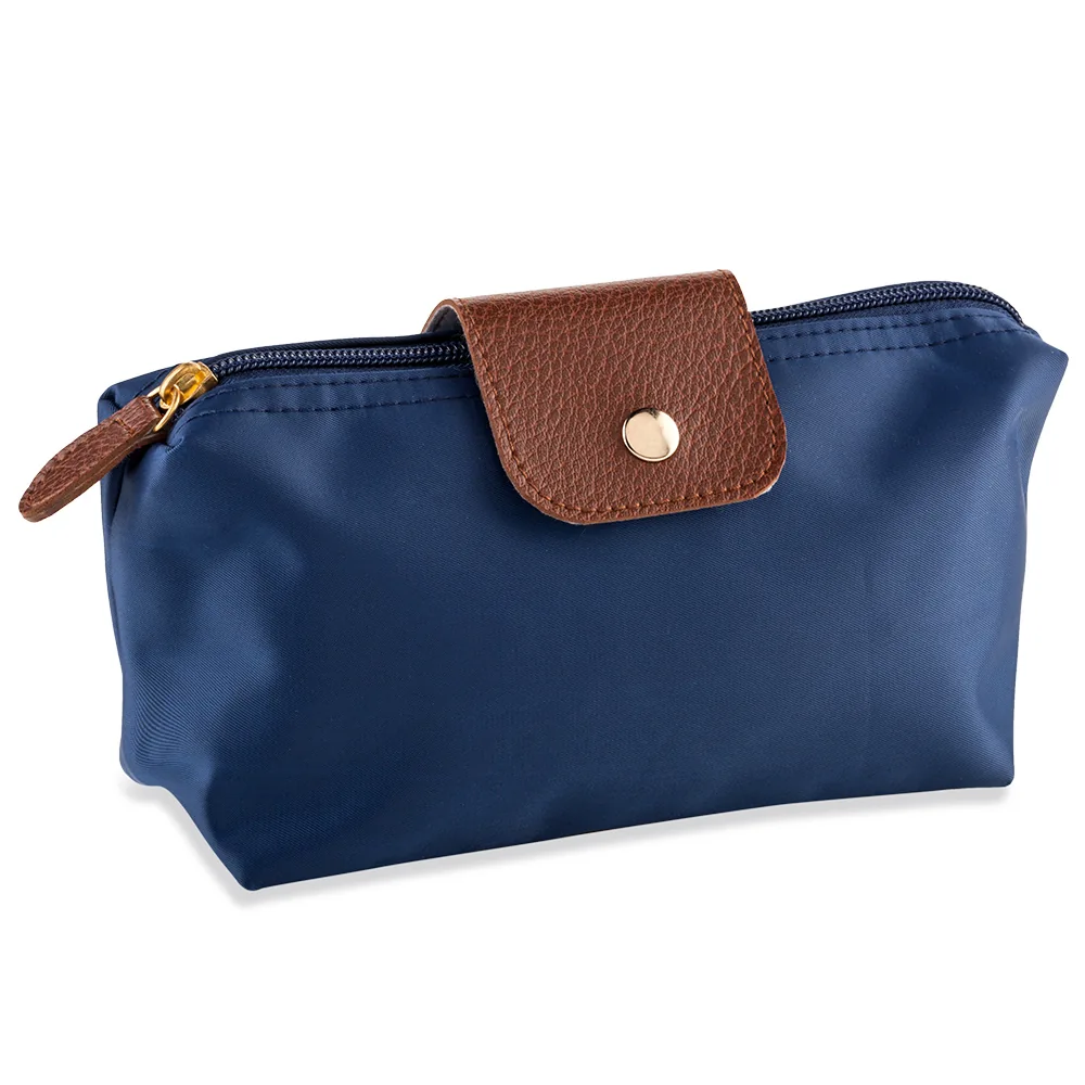 Cosmetiquera en poliéster con cierre tipo broche. Diseño práctico y liviano para uso diario.