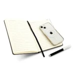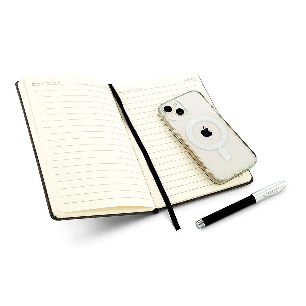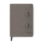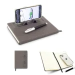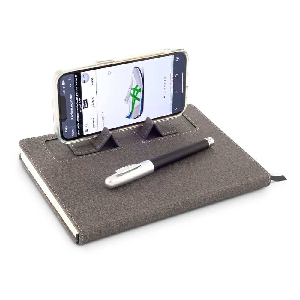 Libreta en poliéster con soporte para celular. Incluye 112 hojas rayadas en tono crema. Ideal para oficina, estudio o uso personal. No incluye bolígrafo.