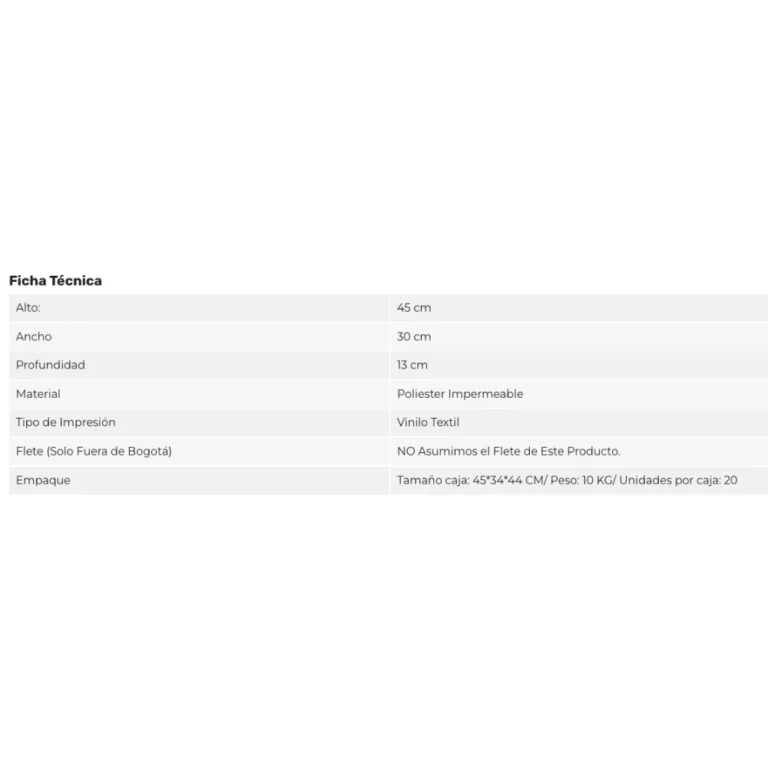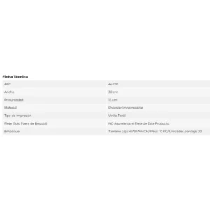 Gracias a sus dimensiones (45 cm de alto, 30 cm de ancho y 13 cm de profundidad), es ideal para estudiantes, trabajadores o como elemento promocional. Además, se puede personalizar fácilmente con vinilo textil, permitiendo que tu marca destaque con estilo y profesionalismo.